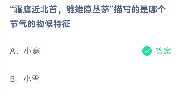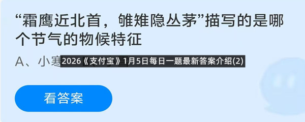 “霜鹰近北首,雊雉隐丛茅”描写的是哪个节气的物候特征?这是今天《支付宝》每日一题的问题,相信我们很多用户都很想知道这个问题的答案是什么?这么一个可以领取饲料的机会相信我们很多用户都不想错过,这里羊托游小编为你带来了2026《支付宝》1月5日每日一题最新答案介绍(2)的全部内容,喜欢的小伙伴欢迎点击进入看看吧。