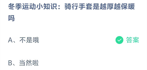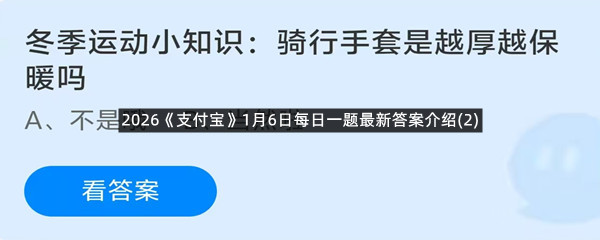冬季运动小知识:骑行手套是越厚越保暖吗?这是今天《支付宝》每日一题的问题,相信我们很多用户都很想知道这个问题的答案是什么?这么一个可以领取饲料的机会相信我们很多用户都不想错过,这里羊托游小编为你带来了2026《支付宝》1月6日每日一题最新答案介绍(2)的全部内容,喜欢的小伙伴欢迎点击进入看看吧。
