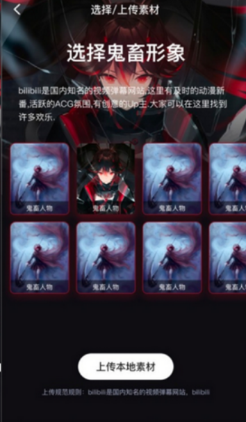 1、功能内置了多种鬼畜形象素材,用户可以先上传本地视频素材,然后自由选择想要使用的鬼畜形象。
