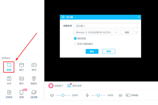 2、在左下角的【直播素材】中选择“抓屏”选项,随后会弹出显示器选择界面,用户可以选择并调整显示器的来源命名,然后点击确定即可,如下图所示: