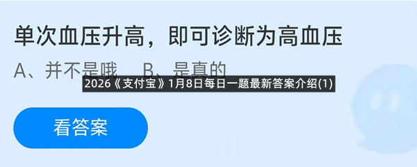 单次血压升高,即可诊断为高血压?这是今天《支付宝》每日一题的问题,相信我们很多用户都很想知道这个问题的答案是什么?这么一个可以领取饲料的机会相信我们很多用户都不想错过,这里羊托游小编为你带来了2026《支付宝》1月8日每日一题最新答案介绍(1)的全部内容,喜欢的小伙伴欢迎点击进入看看吧。