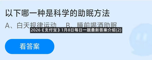 以下哪一种是科学的助眠方法?这是今天《支付宝》每日一题的问题,相信我们很多用户都很想知道这个问题的答案是什么?这么一个可以领取饲料的机会相信我们很多用户都不想错过,这里羊托游小编为你带来了2026《支付宝》1月8日每日一题最新答案介绍(2)的全部内容,喜欢的小伙伴欢迎点击进入看看吧。
