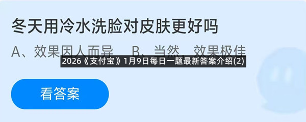 冬天用冷水洗脸对皮肤更好吗?这是今天《支付宝》每日一题的问题,相信我们很多用户都很想知道这个问题的答案是什么?这么一个可以领取饲料的机会相信我们很多用户都不想错过,这里羊托游小编为你带来了2026《支付宝》1月9日每日一题最新答案介绍(2)的全部内容,喜欢的小伙伴欢迎点击进入看看吧。
