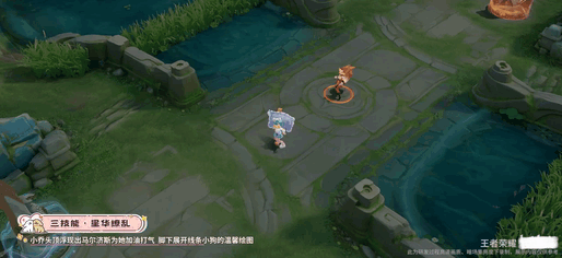 大招开启时,小乔头上出现蹦蹦跳跳的线条小狗,似乎在为你加油打气,脚下的边缘特效也格外温馨。两只小狗的机械式动作十分可爱,命中敌人时,礼物从天而降,每份礼物都闪烁着星光,整体效果充满了治愈和欢乐感。