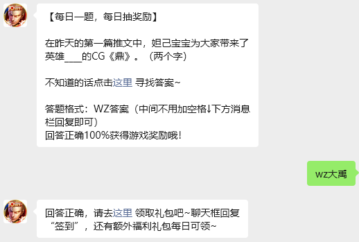 今日问题:在昨天的第一篇推文中,妲己宝宝为大家带来了英雄____的CG《鼎》。(两个字)