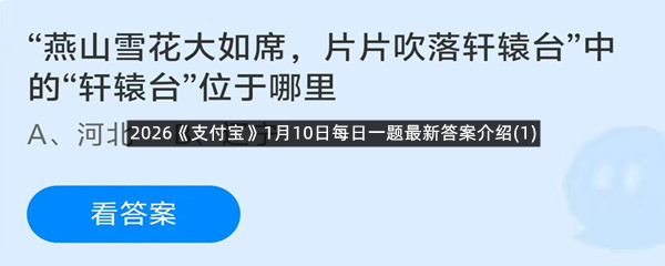“燕山雪花大如席,片片吹落轩辕台”中的“轩辕台”位于哪里?这是今天《支付宝》每日一题的问题,相信我们很多用户都很想知道这个问题的答案是什么?这么一个可以领取饲料的机会相信我们很多用户都不想错过,这里羊托游小编为你带来了2026《支付宝》1月10日每日一题最新答案介绍(1)的全部内容,喜欢的小伙伴欢迎点击进入看看吧。
