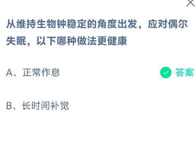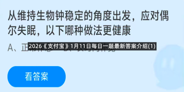 从维持生物钟稳定的角度出发,应对偶尔失眠,以下哪种做法更健康?这是今天《支付宝》每日一题的问题,相信我们很多用户都很想知道这个问题的答案是什么?这么一个可以领取饲料的机会相信我们很多用户都不想错过,这里羊托游小编为你带来了2026《支付宝》1月11日每日一题最新答案介绍(1)的全部内容,喜欢的小伙伴欢迎点击进入看看吧。