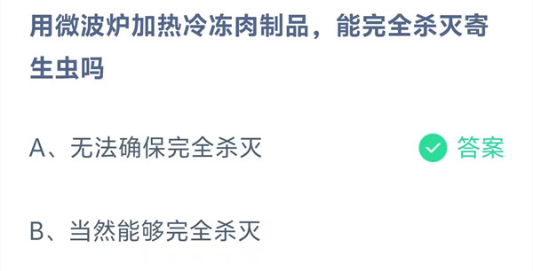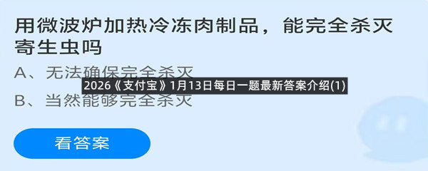 用微波炉加热冷冻肉制品,能完全杀灭寄生虫吗?这是今天《支付宝》每日一题的问题,相信我们很多用户都很想知道这个问题的答案是什么?这么一个可以领取饲料的机会相信我们很多用户都不想错过,这里羊托游小编为你带来了2026《支付宝》1月13日每日一题最新答案介绍(1)的全部内容,喜欢的小伙伴欢迎点击进入看看吧。