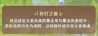 在战斗之中还能够提供【执灯之誓】的效果,提升岩元素的双爆和精通,减轻圣遗物词条的搭配压力。