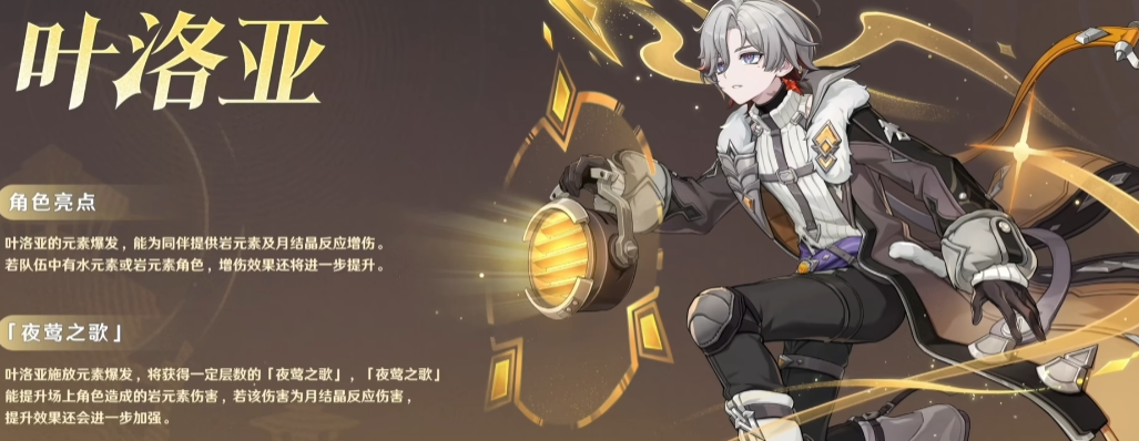 叶洛亚算是月结晶体系的专属辅助,就是为了月结晶推出的辅助角色,所以带上叶洛亚可以很好的发挥出月结晶的效果。