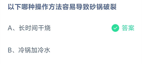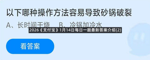 以下哪种操作方法容易导致砂锅破裂?这是今天《支付宝》每日一题的问题,相信我们很多用户都很想知道这个问题的答案是什么?这么一个可以领取饲料的机会相信我们很多用户都不想错过,这里羊托游小编为你带来了2026《支付宝》1月14日每日一题最新答案介绍(2)的全部内容,喜欢的小伙伴欢迎点击进入看看吧。