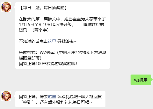 今日问题:在昨天的第一篇推文中,妲己宝宝为大家带来了1月15日全新10V10玩法升级,____降临峡谷的资讯~(两个字)