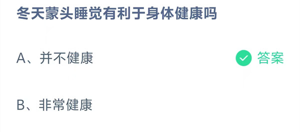 冬天蒙头睡觉有利于身体健康吗?这是今天《支付宝》每日一题的问题,相信我们很多用户都很想知道这个问题的答案是什么?这么一个可以领取饲料的机会相信我们很多用户都不想错过,这里羊托游小编为你带来了2026《支付宝》1月15日每日一题最新答案介绍(2)的全部内容,喜欢的小伙伴欢迎点击进入看看吧。