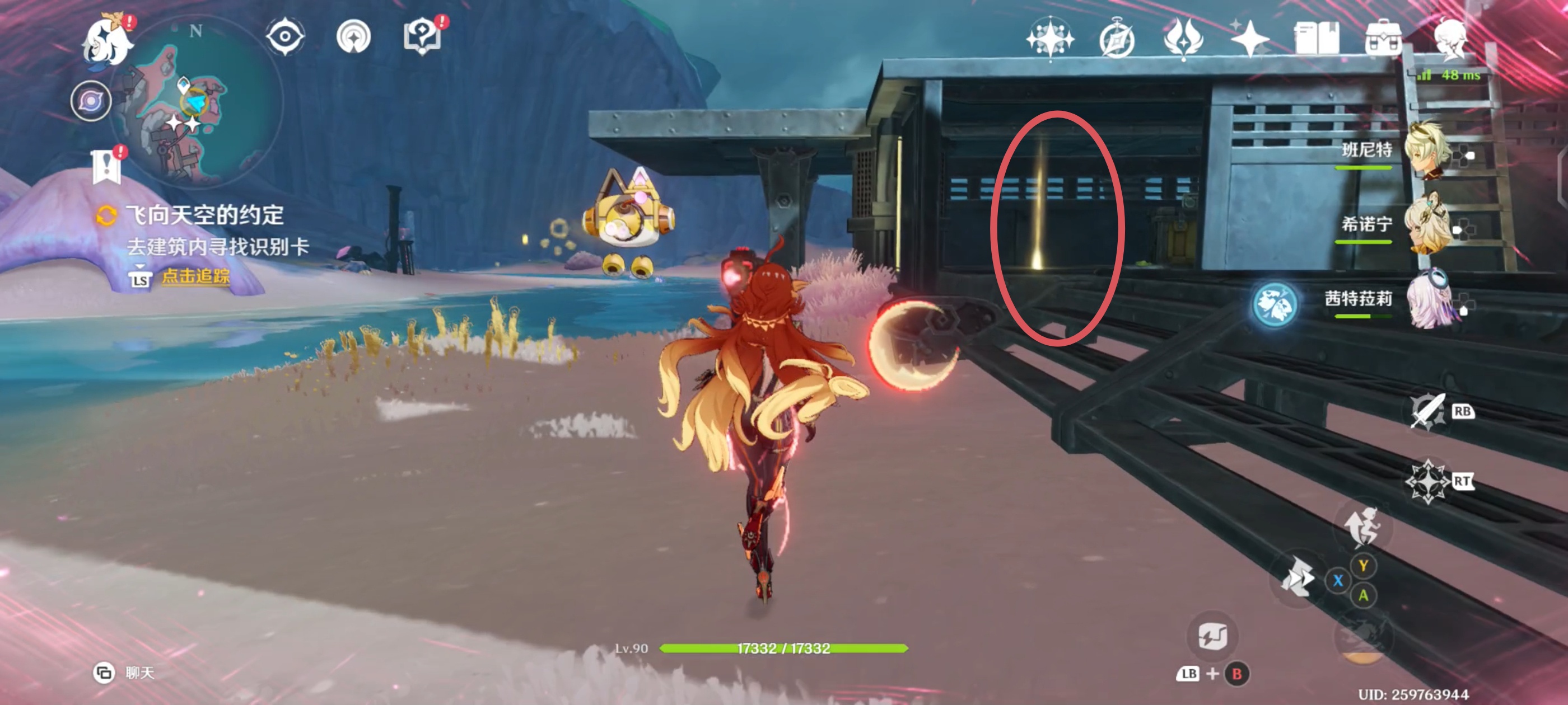 对话完成后,将视角向左转,走到[受月矩力影响的植物]旁,拾取识别卡并放入机关以打开屏障,然后进入对话;