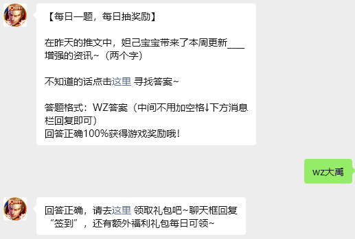 今日问题:在昨天的推文中,妲己宝宝带来了本周更新____增强的资讯~(两个字)