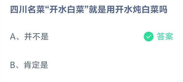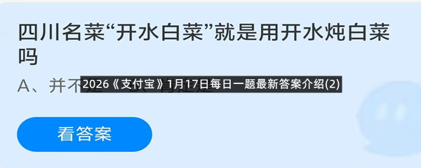 四川名菜“开水白菜”就是用开水炖白菜吗?这是今天《支付宝》每日一题的问题,相信我们很多用户都很想知道这个问题的答案是什么?这么一个可以领取饲料的机会相信我们很多用户都不想错过,这里羊托游小编为你带来了2026《支付宝》1月17日每日一题最新答案介绍(2)的全部内容,喜欢的小伙伴欢迎点击进入看看吧。