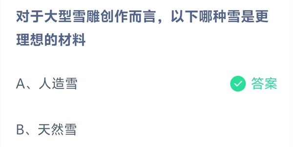 对于大型雪雕创作而言,以下哪种雪是更理想的材料?这是今天《支付宝》每日一题的问题,相信我们很多用户都很想知道这个问题的答案是什么?这么一个可以领取饲料的机会相信我们很多用户都不想错过,这里羊托游小编为你带来了2026《支付宝》1月18日每日一题最新答案介绍(2)的全部内容,喜欢的小伙伴欢迎点击进入看看吧。