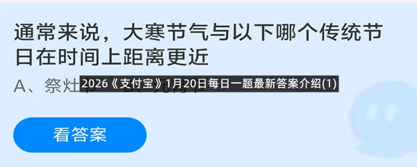 通常来说,大寒节气与以下哪个传统节日在时间上距离更近?这是今天《支付宝》每日一题的问题,相信我们很多用户都很想知道这个问题的答案是什么?这么一个可以领取饲料的机会相信我们很多用户都不想错过,这里羊托游小编为你带来了2026《支付宝》1月20日每日一题最新答案介绍(1)的全部内容,喜欢的小伙伴欢迎点击进入看看吧。