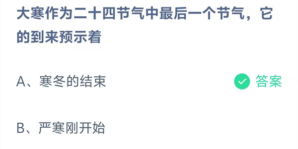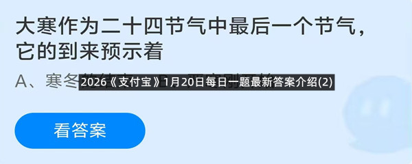 大寒作为二十四节气中最后一个节气,它的到来预示着?这是今天《支付宝》每日一题的问题,相信我们很多用户都很想知道这个问题的答案是什么?这么一个可以领取饲料的机会相信我们很多用户都不想错过,这里羊托游小编为你带来了2026《支付宝》1月20日每日一题最新答案介绍(2)的全部内容,喜欢的小伙伴欢迎点击进入看看吧。