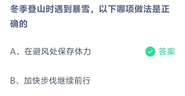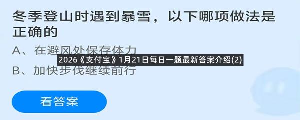 冬季登山时遇到暴雪,以下哪项做法是正确的?这是今天《支付宝》每日一题的问题,相信我们很多用户都很想知道这个问题的答案是什么?这么一个可以领取饲料的机会相信我们很多用户都不想错过,这里羊托游小编为你带来了2026《支付宝》1月21日每日一题最新答案介绍(2)的全部内容,喜欢的小伙伴欢迎点击进入看看吧。