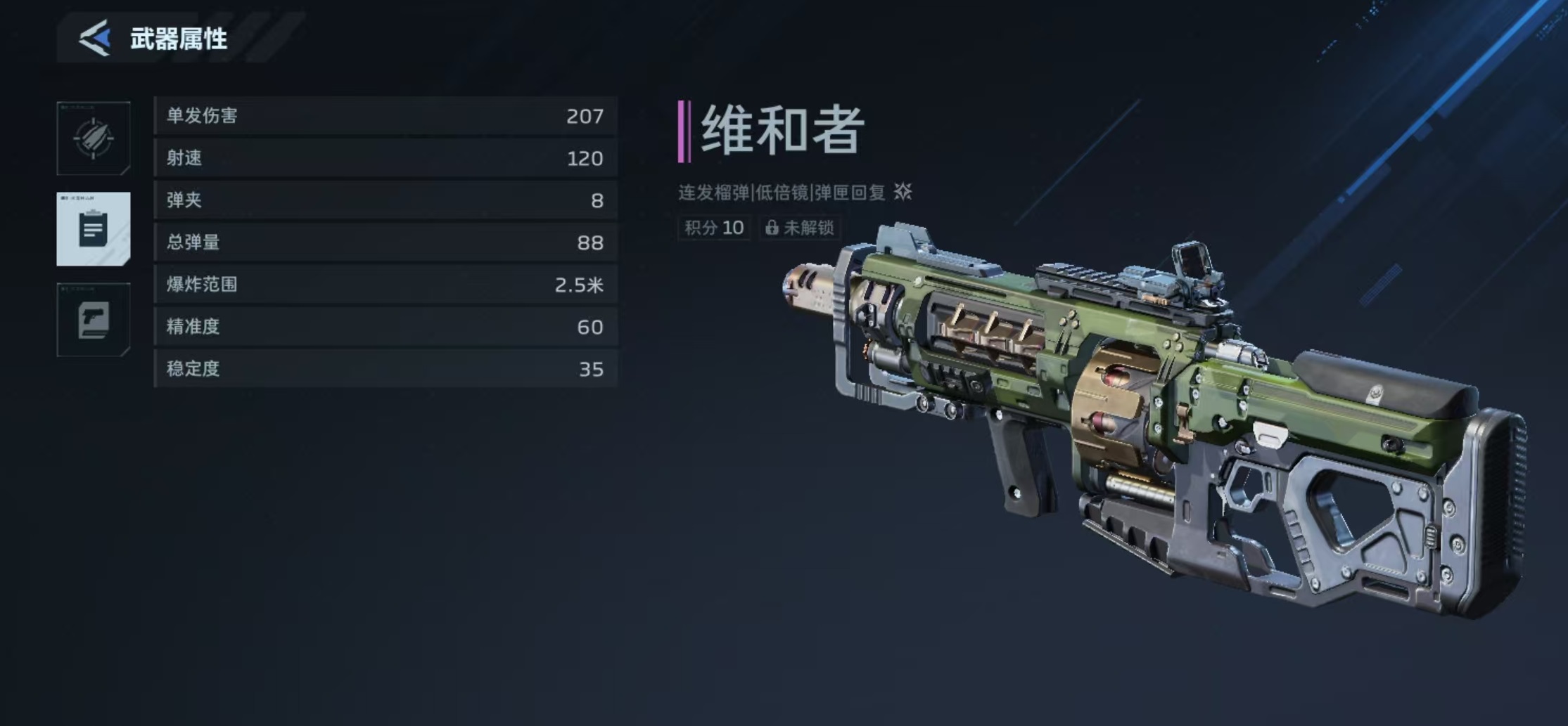 基础属性方面:单发爆炸伤害为207点,理论射速可达120发/分钟,弹匣容量8发,总携弹量88发,爆炸有效半径为2.5米。