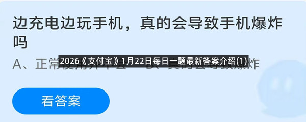边充电边玩手机,真的会导致手机爆炸吗?这是今天《支付宝》每日一题的问题,相信我们很多用户都很想知道这个问题的答案是什么?这么一个可以领取饲料的机会相信我们很多用户都不想错过,这里羊托游小编为你带来了2026《支付宝》1月22日每日一题最新答案介绍(1)的全部内容,喜欢的小伙伴欢迎点击进入看看吧。
