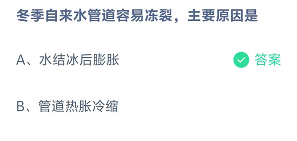 冬季自来水管道容易冻裂,主要原因是?这是今天《支付宝》每日一题的问题,相信我们很多用户都很想知道这个问题的答案是什么?这么一个可以领取饲料的机会相信我们很多用户都不想错过,这里羊托游小编为你带来了2026《支付宝》1月23日每日一题最新答案介绍(1)的全部内容,喜欢的小伙伴欢迎点击进入看看吧。