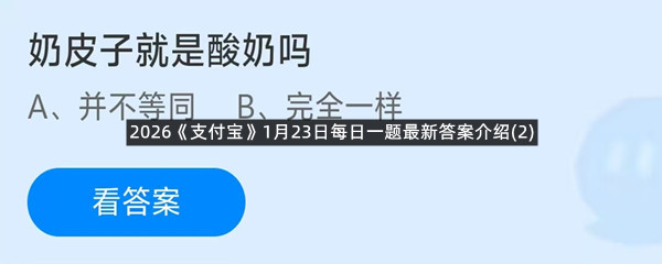 奶皮子就是酸奶吗?这是今天《支付宝》每日一题的问题,相信我们很多用户都很想知道这个问题的答案是什么?这么一个可以领取饲料的机会相信我们很多用户都不想错过,这里羊托游小编为你带来了2026《支付宝》1月23日每日一题最新答案介绍(2)的全部内容,喜欢的小伙伴欢迎点击进入看看吧。