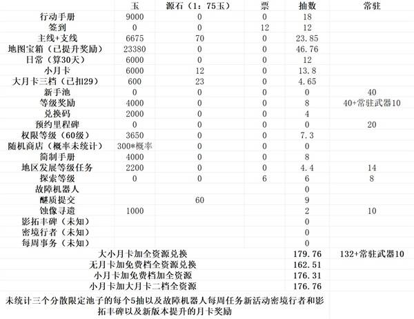 周期性资源则按对应周期计算,日常和周常内容按照版本周期7周共49天(依据单个卡池1618天推算整个版本约4850天),卡池按3个周期计算,活动奖励也统一纳入周期性统计。