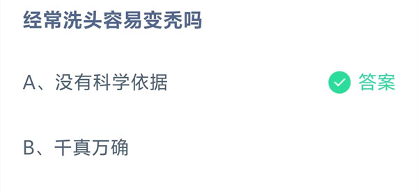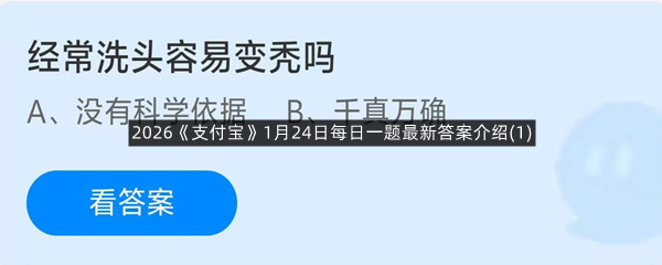 经常洗头容易变秃吗?这是今天《支付宝》每日一题的问题,相信我们很多用户都很想知道这个问题的答案是什么?这么一个可以领取饲料的机会相信我们很多用户都不想错过,这里羊托游小编为你带来了2026《支付宝》1月24日每日一题最新答案介绍(1)的全部内容,喜欢的小伙伴欢迎点击进入看看吧。