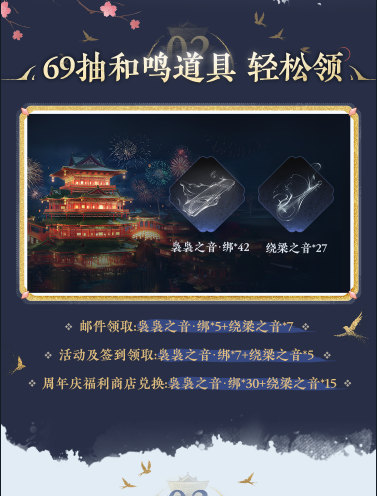 2、免费获取69抽道具:通过登录邮件、签到、福利商店等途径,可领取42个「袅袅之音·绑」和27个「绕梁之音」,总计69抽保底资源,让玩家轻松获得丰富道具。