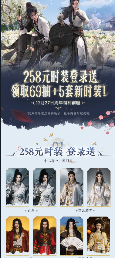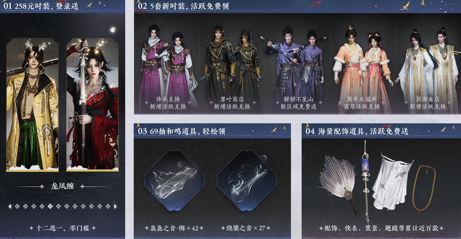 1、登录即领258元时装:在版本更新后登录游戏,即可从12款专属外观(如白龙、穿云游雪、赤沙等)中免费任选一套。若玩家已集齐全部时装,可将其兑换为10张折音券或16个「袅袅之音·绑」。