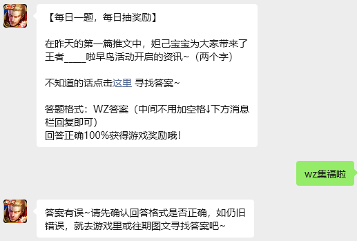 今日问题:在昨天的第一篇推文中,妲己宝宝为大家带来了王者_____啦早鸟活动开启的资讯~(两个字)
