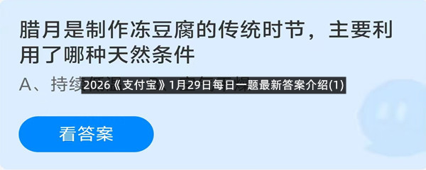 腊月是制作冻豆腐的传统时节,主要利用了哪种天然条件?这是今天《支付宝》每日一题的问题,相信我们很多用户都很想知道这个问题的答案是什么?这么一个可以领取饲料的机会相信我们很多用户都不想错过,这里羊托游小编为你带来了2026《支付宝》1月29日每日一题最新答案介绍(1)的全部内容,喜欢的小伙伴欢迎点击进入看看吧。