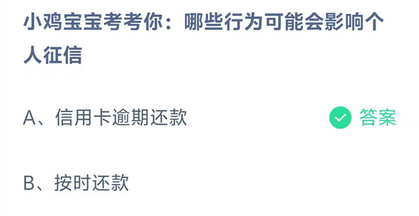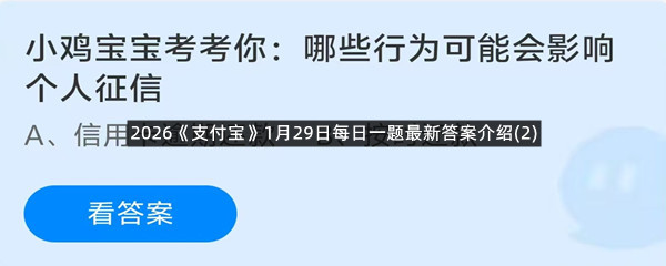 小鸡宝宝考考你:哪些行为可能会影响个人征信?这是今天《支付宝》每日一题的问题,相信我们很多用户都很想知道这个问题的答案是什么?这么一个可以领取饲料的机会相信我们很多用户都不想错过,这里羊托游小编为你带来了2026《支付宝》1月29日每日一题最新答案介绍(2)的全部内容,喜欢的小伙伴欢迎点击进入看看吧。