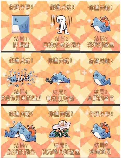 第九个,破镜重圆,多次拒绝小鲨鱼后出门遇到流浪的鲨鱼,将它收留即可触发该结局。