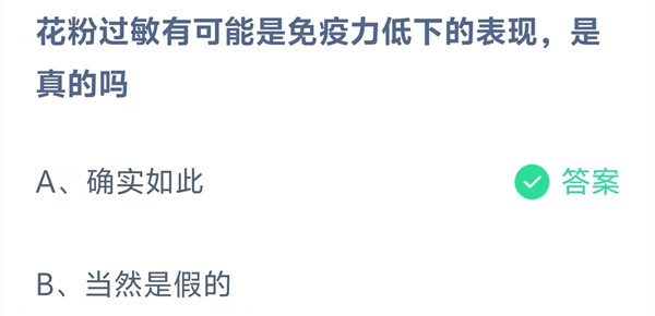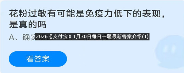 花粉过敏有可能是免疫力低下的表现,是真的吗?这是今天《支付宝》每日一题的问题,相信我们很多用户都很想知道这个问题的答案是什么?这么一个可以领取饲料的机会相信我们很多用户都不想错过,这里羊托游小编为你带来了2026《支付宝》1月30日每日一题最新答案介绍(1)的全部内容,喜欢的小伙伴欢迎点击进入看看吧。