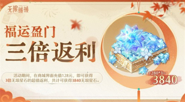 活动期间,商城充值128元可获得3倍无垠星石返利,总计3840无垠星石(限购一次)。