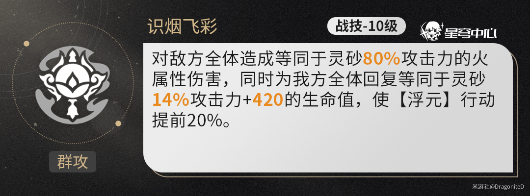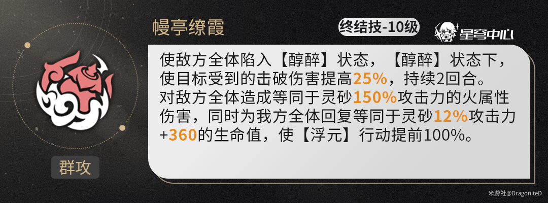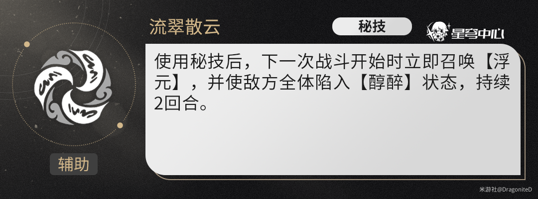 核心辅助技能。能让敌方全体进入【醇醉】状态,使其承受的击破伤害提升(满级约25%),持续2回合。同时造成群体伤害、治疗队伍,并立即触发「浮元」的行动。