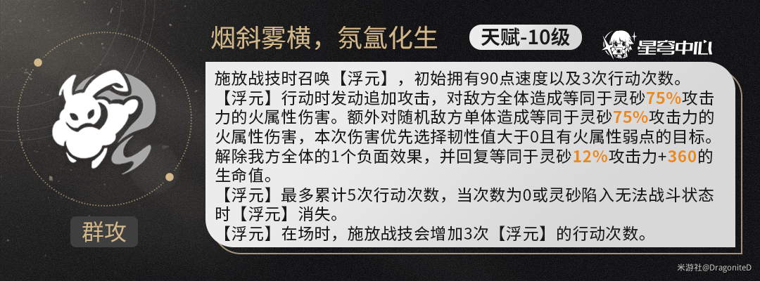 造成范围伤害并同时为全队回复生命,同时让「浮元」的行动顺序提前20%。这是召唤并维持「浮元」在场的主要操作方式。