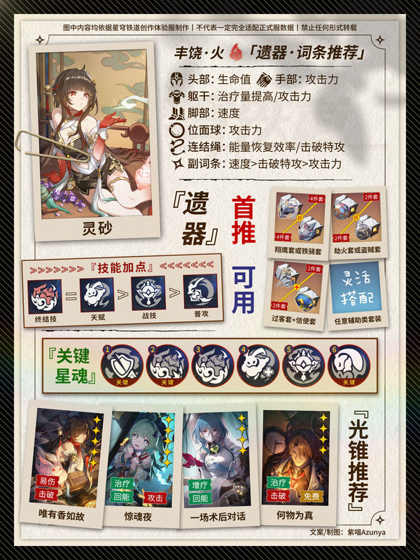 朱燎:核心转化行迹。提升灵砂的攻击力和治疗量,提升幅度与击破特攻挂钩(最高需200%击破特攻才能完全加成)。这是决定她装备方向的关键。