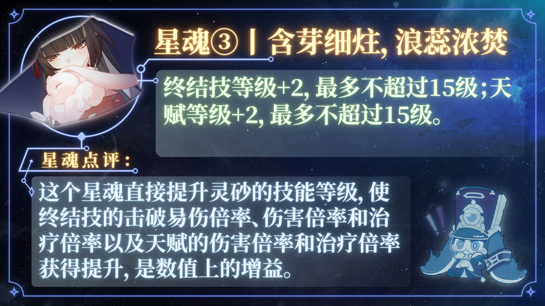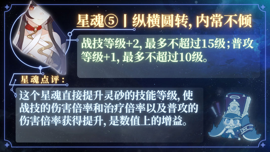6、星魂6:非常强大。对于击破队来说,可以全面增强辅助削韧、灵砂自身伤害和抗性加成;对常规队伍,也能显著提升抗性乘区。在需要火削韧的情况下,也更加便利。但由于星魂2、3、4、5的性价比不高,使得星魂6的提升成本相对较高。预算充足的玩家可以考虑抽取,预算有限的玩家则不如将资源投入到其他队友身上。