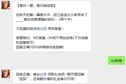 今日问题:在昨天的第一篇推文中,妲己宝宝为大家带来了_____普攻伤害增强的资讯~(两个字)
