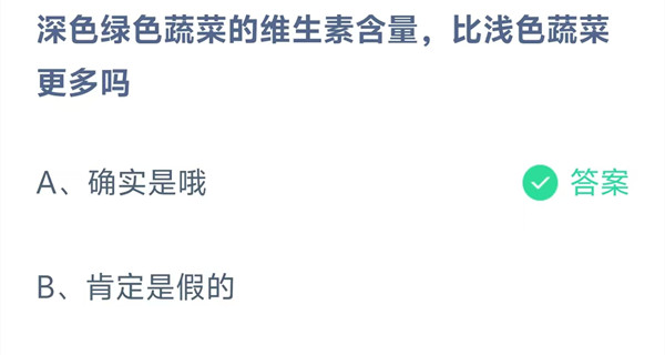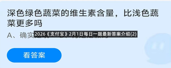 深色绿色蔬菜的维生素含量,比浅色蔬菜更多吗?这是今天《支付宝》每日一题的问题,相信我们很多用户都很想知道这个问题的答案是什么?这么一个可以领取饲料的机会相信我们很多用户都不想错过,这里羊托游小编为你带来了2026《支付宝》2月1日每日一题最新答案介绍(2)的全部内容,喜欢的小伙伴欢迎点击进入看看吧。