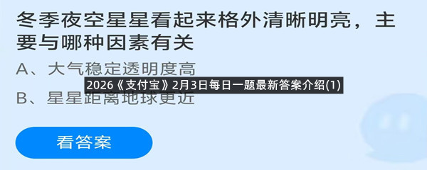冬季夜空星星看起来格外清晰明亮,主要与哪种因素有关?这是今天《支付宝》每日一题的问题,相信我们很多用户都很想知道这个问题的答案是什么?这么一个可以领取饲料的机会相信我们很多用户都不想错过,这里羊托游小编为你带来了2026《支付宝》2月3日每日一题最新答案介绍(1)的全部内容,喜欢的小伙伴欢迎点击进入看看吧。