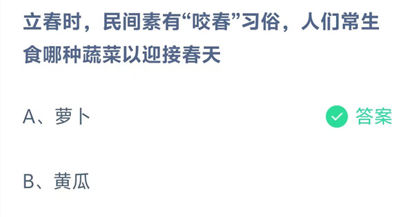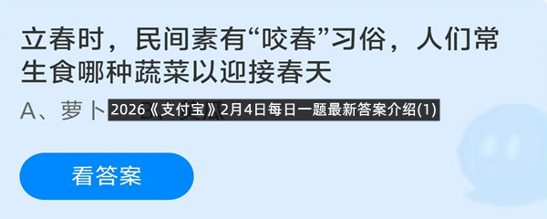 立春时,民间素有“咬春”习俗,人们常生食哪种蔬菜以迎接春天?这是今天《支付宝》每日一题的问题,相信我们很多用户都很想知道这个问题的答案是什么?这么一个可以领取饲料的机会相信我们很多用户都不想错过,这里羊托游小编为你带来了2026《支付宝》2月4日每日一题最新答案介绍(1)的全部内容,喜欢的小伙伴欢迎点击进入看看吧。