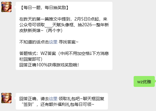 今日问题:在昨天的第一篇推文中提到,2月5日0点起,来公众号可领取____天赋头像框、抽2026一整年新皮肤新英雄~(两个字)