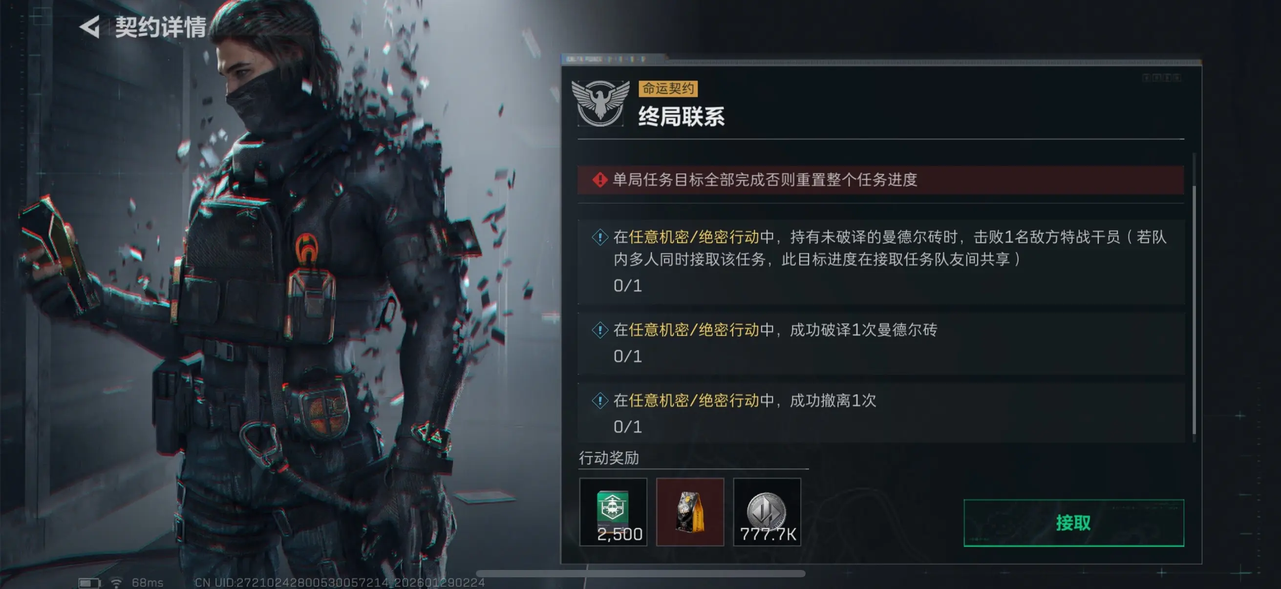任意机密或绝密行动中,手持尚未破译的曼德尔砖时,击败1名敌方特战干员(如果队伍中有多名干员同时接取此任务,击败目标的进度会在任务接取的队友之间共享);