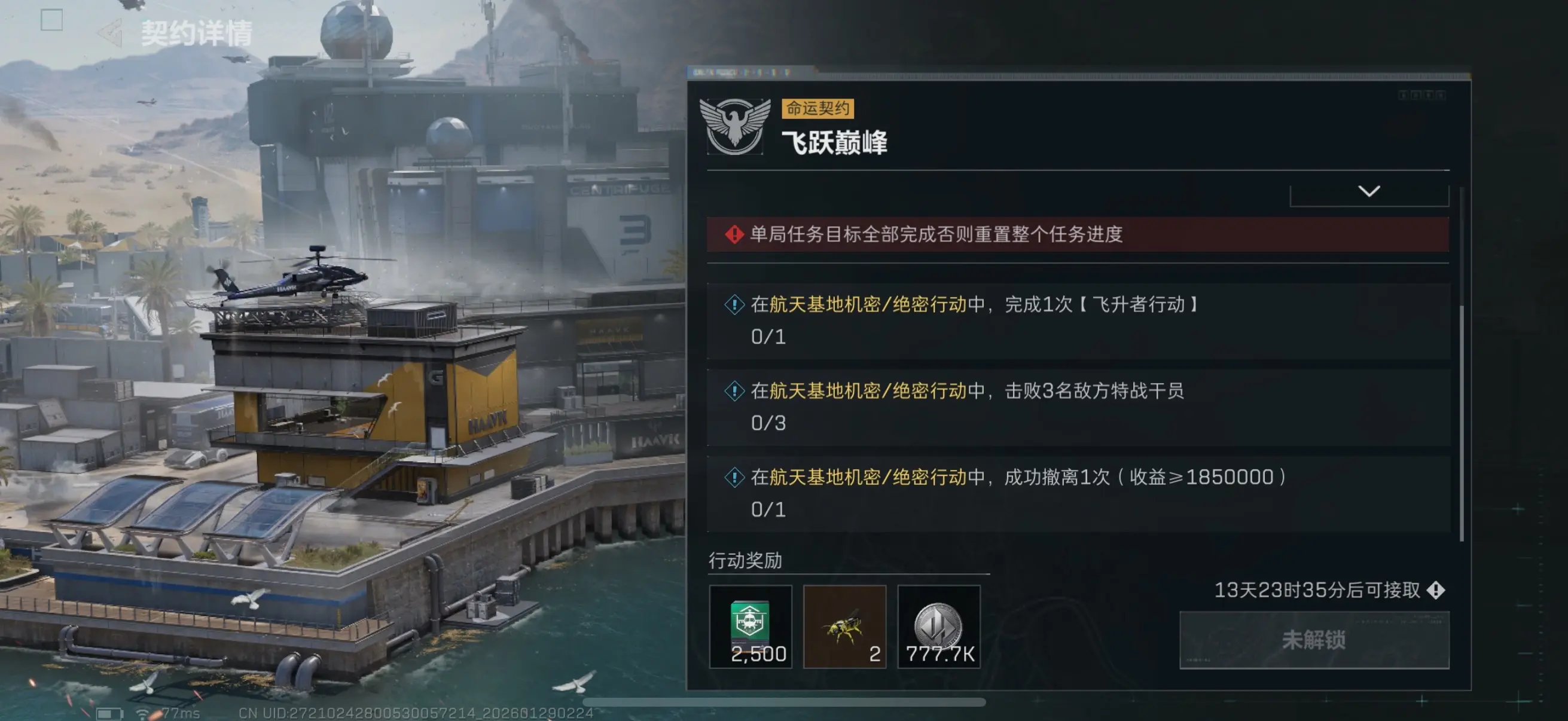 航天基地机密/绝密行动中,成功撤离1次(收益>1850000)