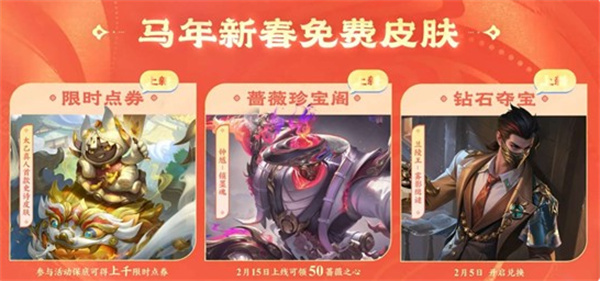 2月15日零点登录游戏即可领取丰富新春福利,解锁限定皮肤,与全体玩家一同在峡谷迎接马年的好运